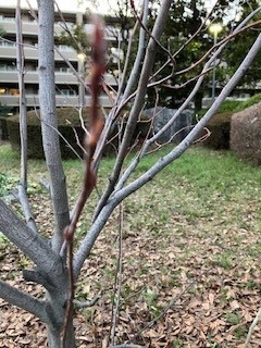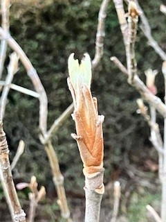 カシワバアジサイの芽も、裸の枝から力強か大きくなりもう直ぐ小さな葉を広げることでしょう。